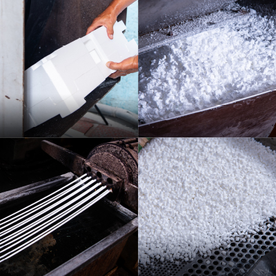 ①『ピオセラン』を粉砕機に投入(左上)②細かく粉砕される(右上)③熱で溶かし、細い棒状に押し出される(左下)④細かく裁断され、リサイクル原料になる(右下)